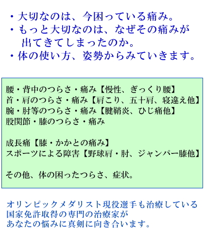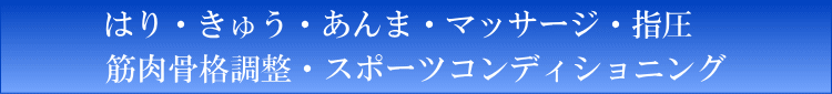 | ・はりきゅう ・あん摩、 マッサージ、指圧 ・筋肉骨格調整 (リハビリ治療) ・スポーツ コンディショニング |
